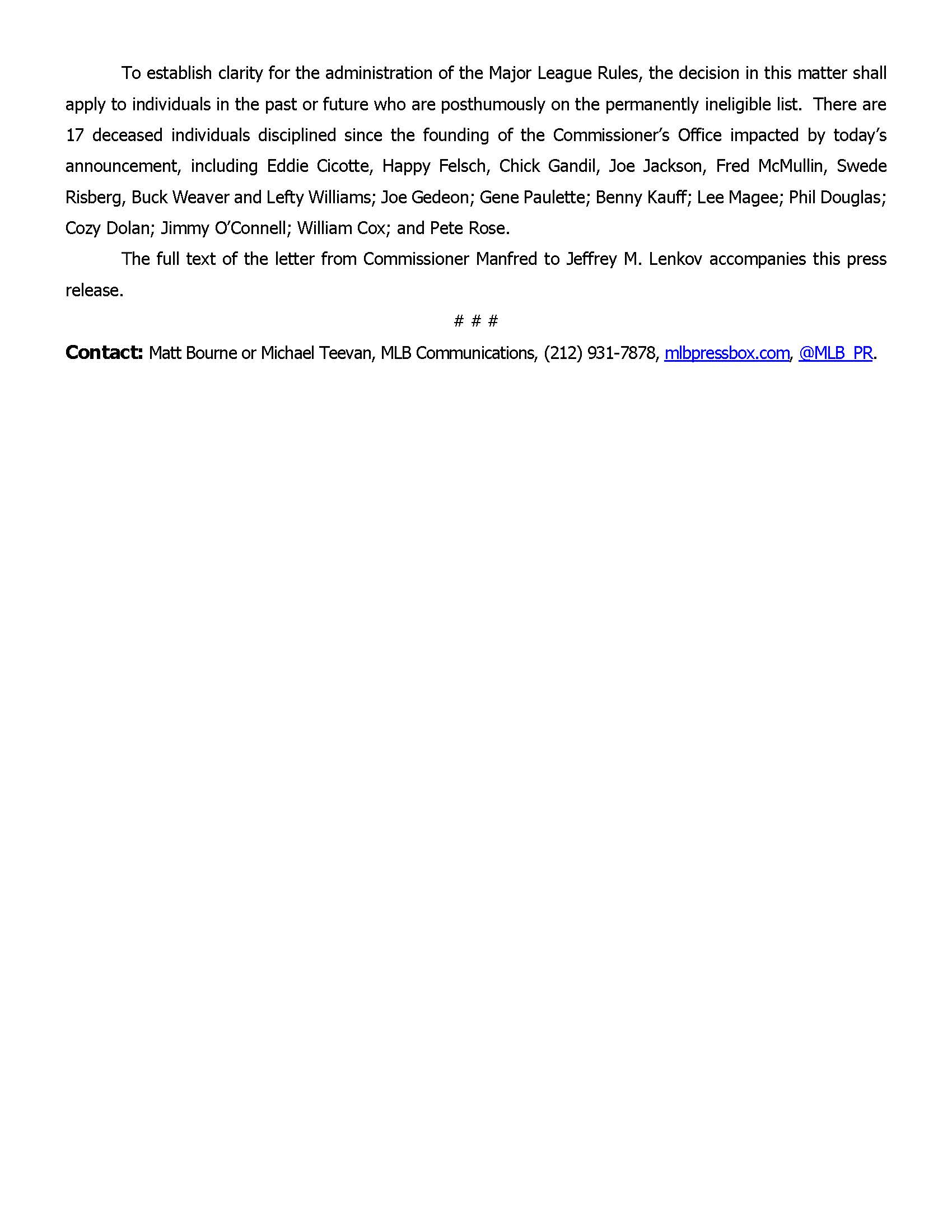 Commissioner Manfred's Letter Clearing Joe Jackson - Page 3